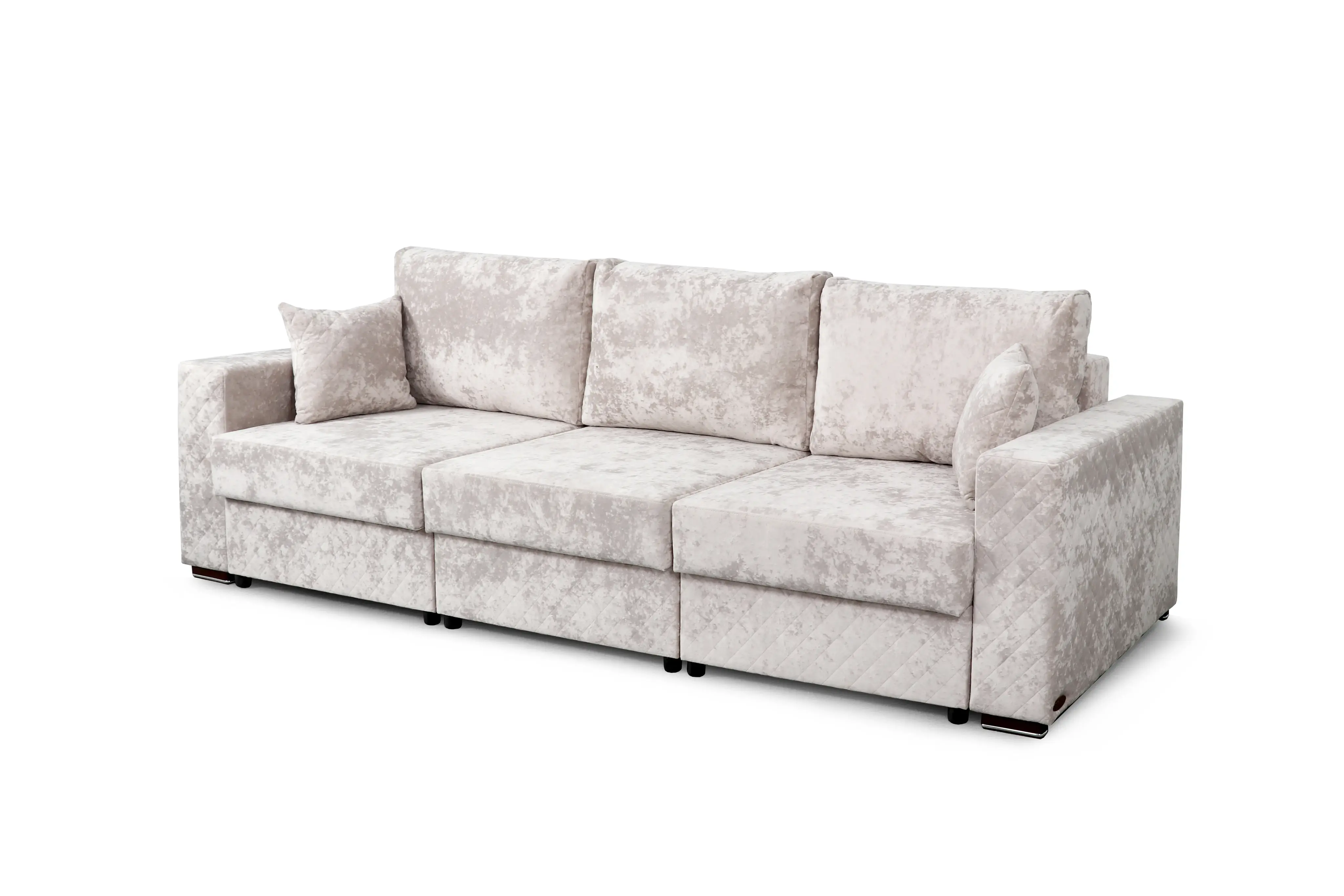 Обивка дивана выполнена из приятного на ощупь велюра, который устойчив к износу. Это гарантирует долгий срок службы дивана и сохранение его первоначального вида.