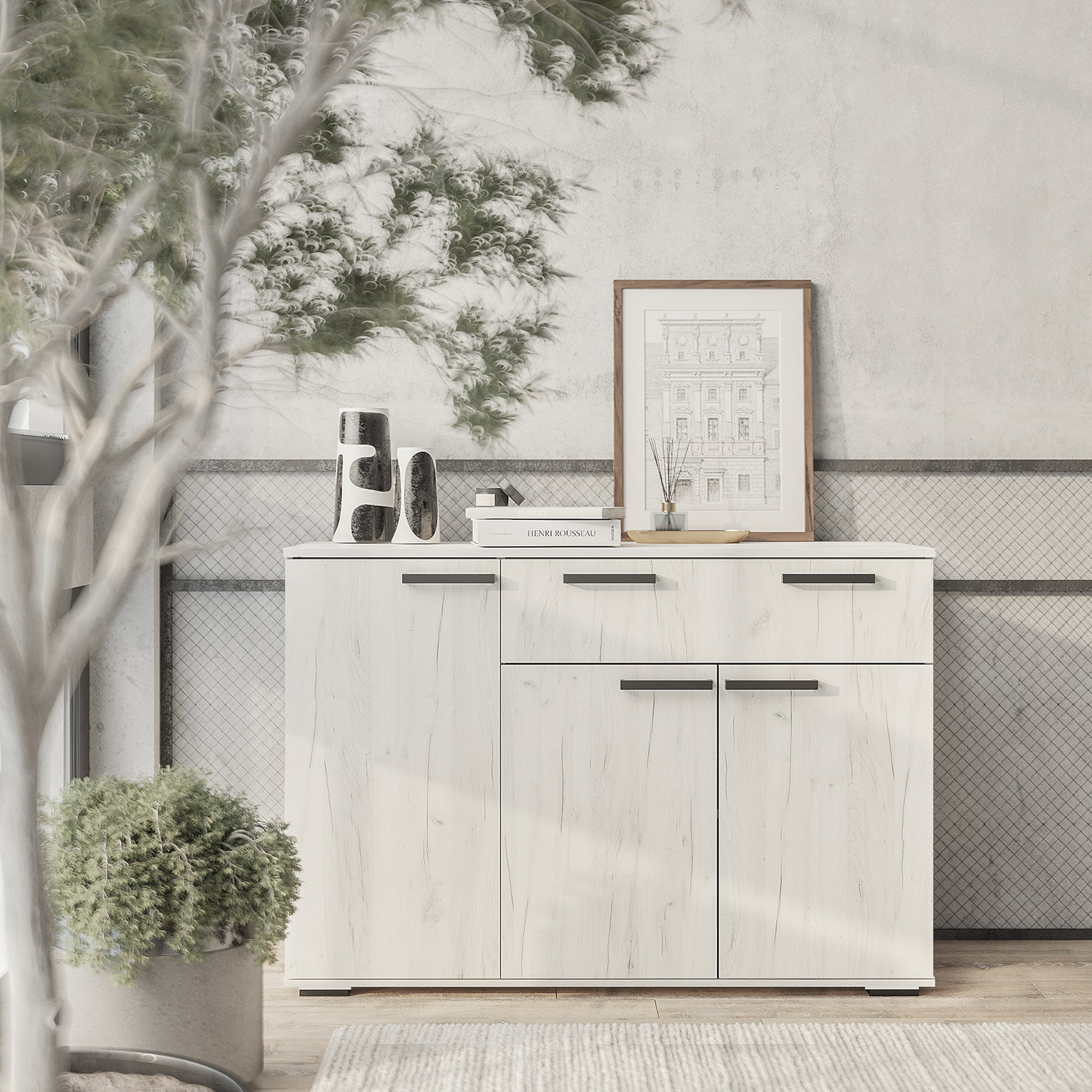 Вместительная модель (120х82,8х46 см ШВГ) поможет хранить все необходимые вещи благодаря трём дверям, одному ящику и двум внутренним полкам.